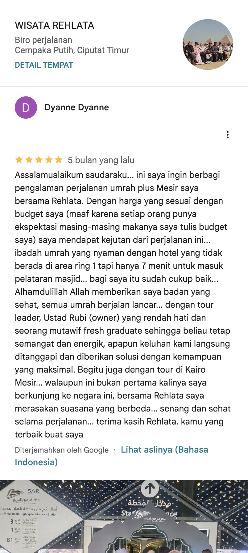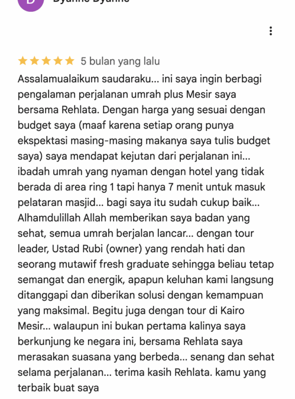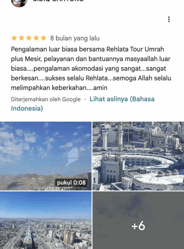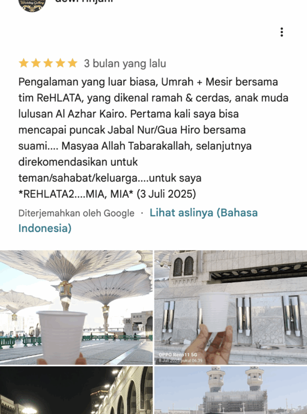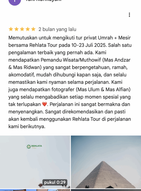 Pesan Paket Umroh Terbaik, Berangkat dengan Tenang. Hubungi Berangkat Tanpa Cemas, Ibadah Lebih Khusyuk. Update pemberangkatan Umrah 2025. Pastikan tidak kehabisan kursi! Pilih kebutuhan perjalananmu, Kami siap layani. Pilih Kebutuhan Perjalananmu, Kami Siap Layani. Kunjungi Halaman Kunjungi Halaman Kunjungi Halaman Kunjungi Halaman Kunjungi Halaman Promo terbaik buat liburan irit! Instagram Reels Kami abadikan momen perjalanan baik dalam bentuk foto atau vidio Lihat semua reels Mitra Kami Didukung mitra terbaik demi kenyamanan setiap langkah perjalanan. Testimoni dari Jemaah Apa kata mereka selama bersama Rehlata Tour? Kenapa pesan di Rehlata Tour? Melayani Melayani dengan hati, sepenuh jiwa. Amanah Amanah dalam setiap kepercayaan yang diberikan. Berjamaah Berorientasi pada kepuasan dan kekhusyukan jemaah. Ramah Ramah dan profesional dalam setiap interaksi. Unggul Unggul dalam memberikan fasilitas dan bimbingan. Ridla Raih ridha Allah sebagai tujuan utama. Artikel Baru Update informasi penting tentang dokumen perjalanan dan tata cara ibadah Artikel Section Memuat artikel...